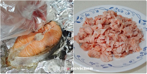 2.烤熟的鮭魚用手將魚肉剝成小塊,並且仔細的挑掉魚刺。