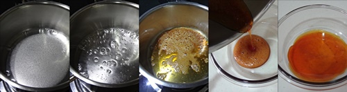 1. 將白糖35g及水1大匙放進鍋中用中火加熱至白糖融化成咖啡色