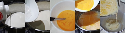 4. 將牛奶及白糖倒入剛剛煮焦糖的鍋中用小火加熱至微溫後,